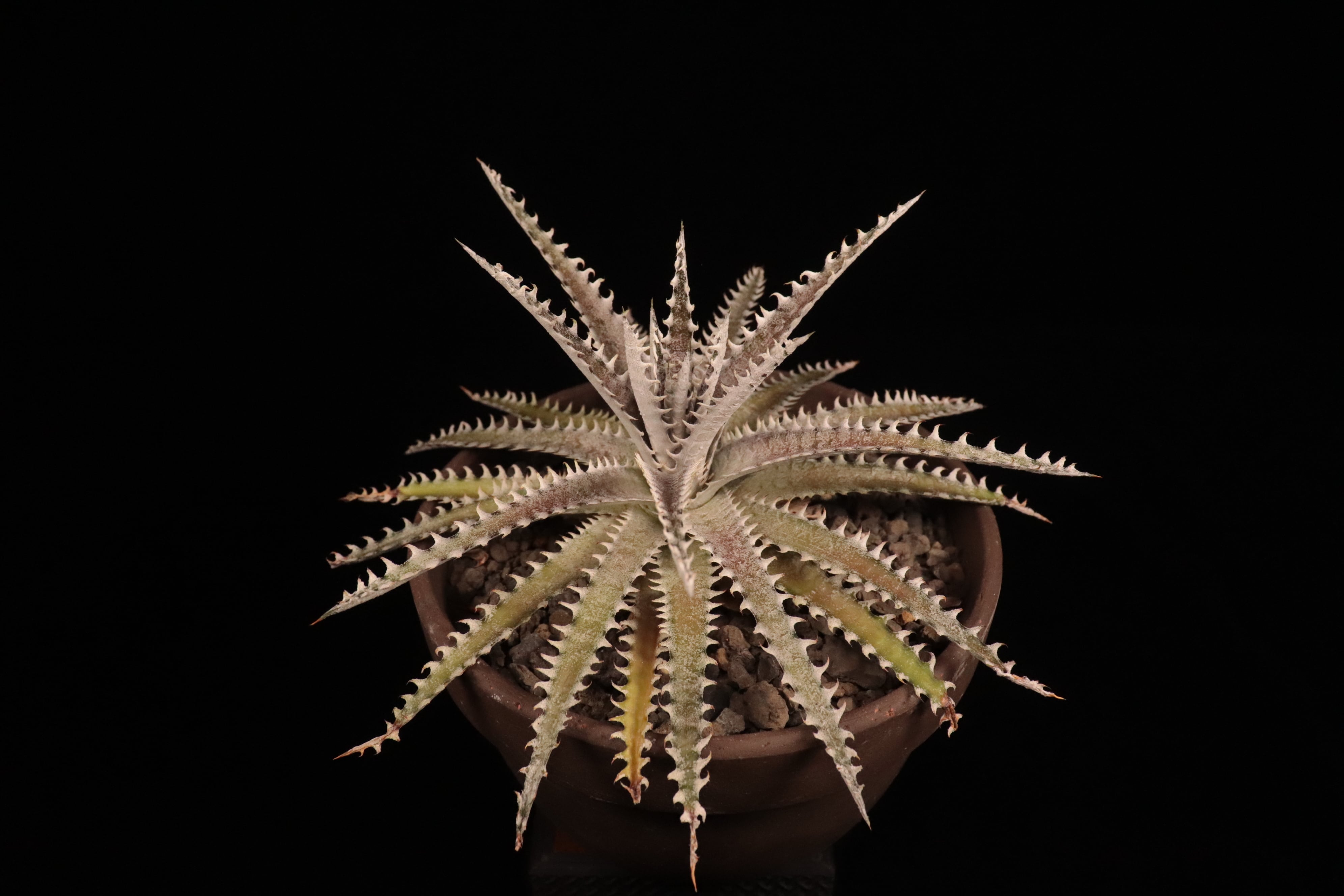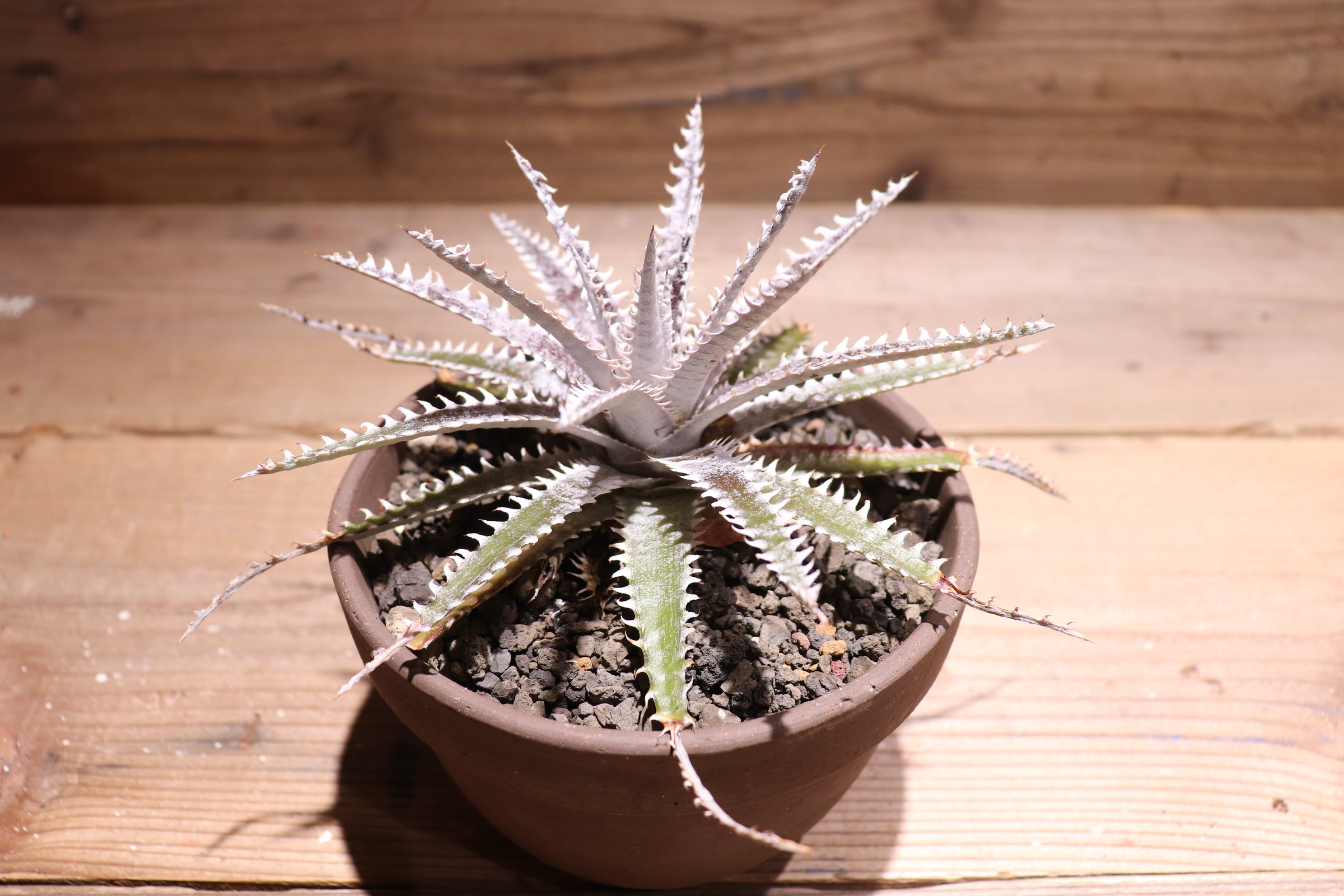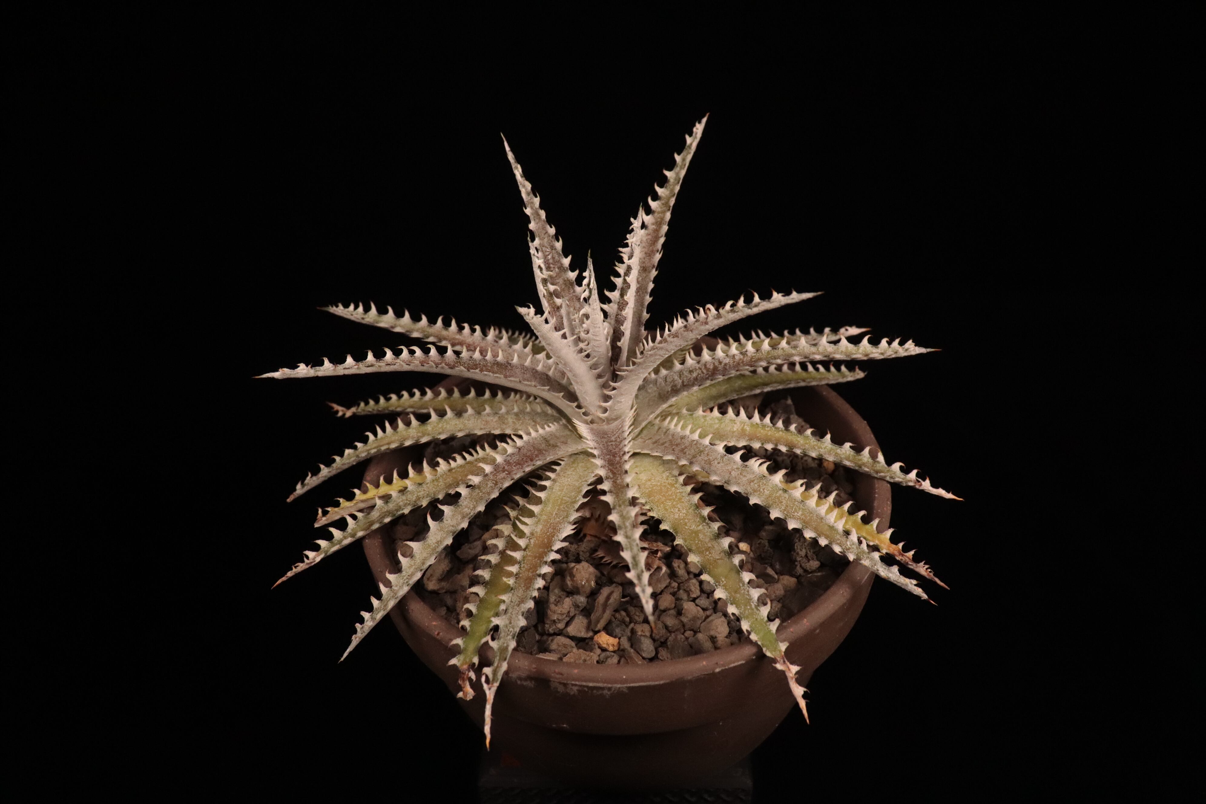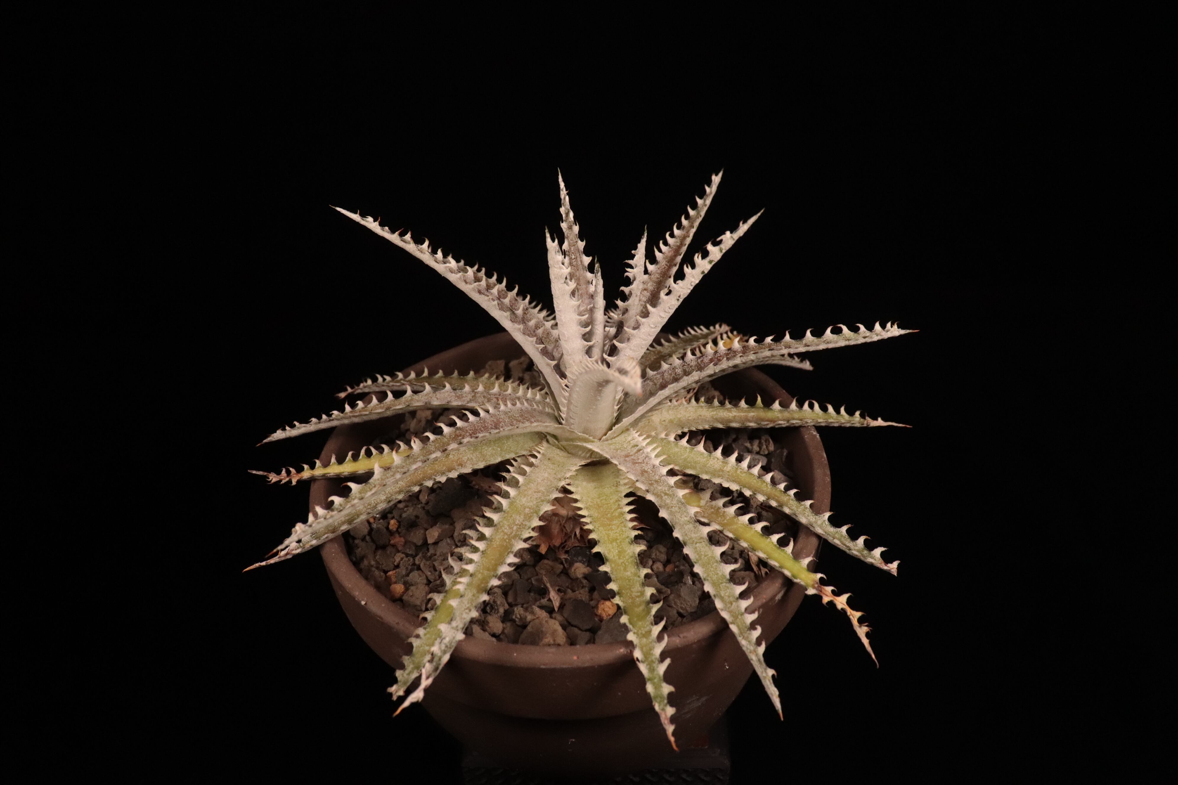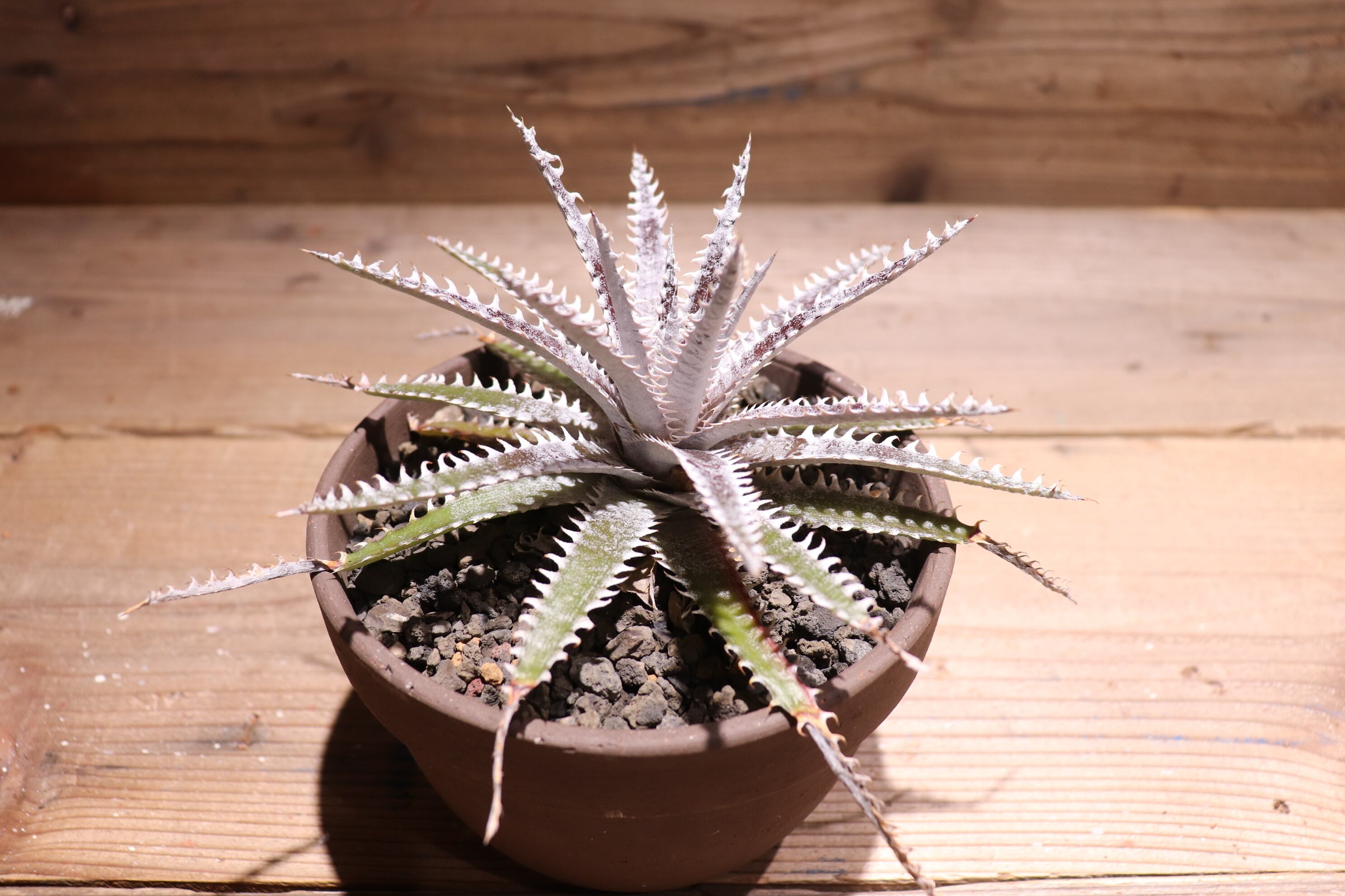 直径35cmにもなる品種で、細長く硬い葉に曲がった白い棘が特徴。