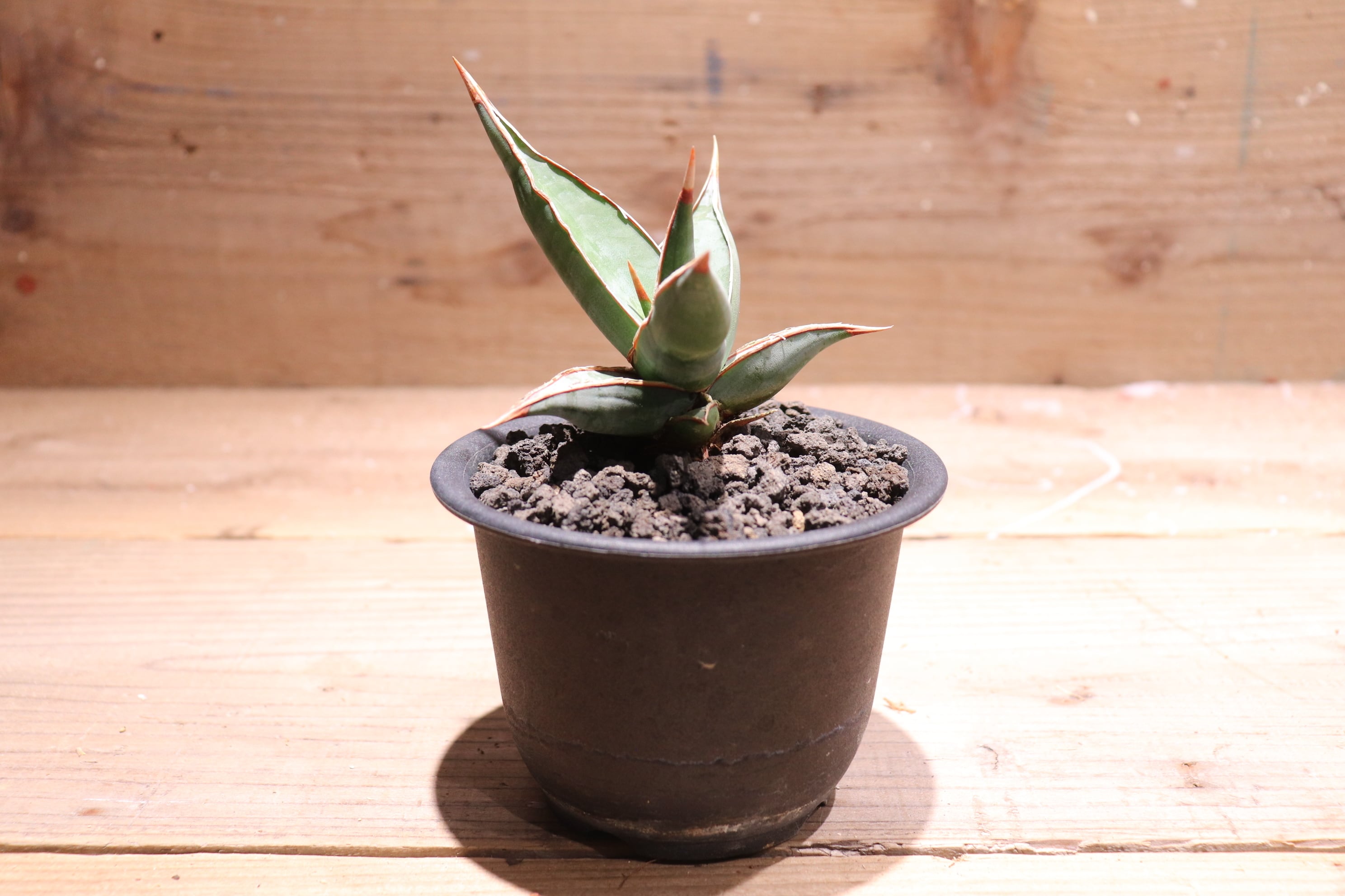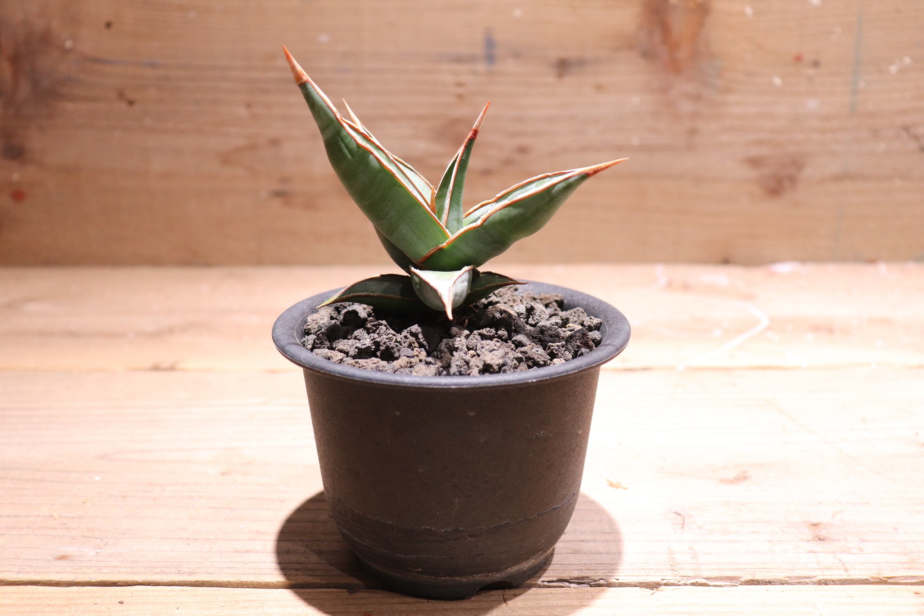 ケニア北部の乾燥した地域が原産で、葉は厚くて先が細く、上側の深い溝を除いて円筒形です。 堅い葉は鋭い棘の先端に向かって先細になっています。